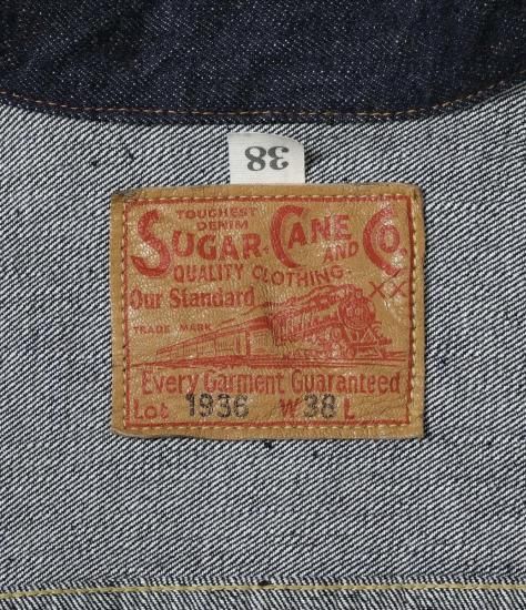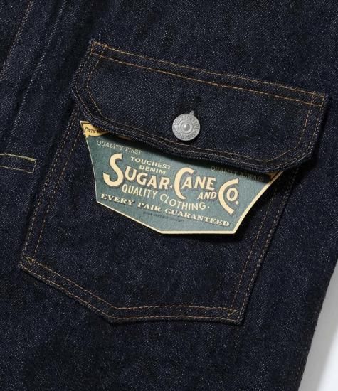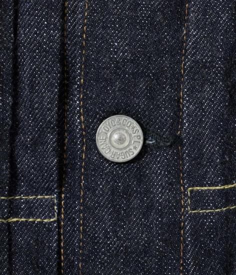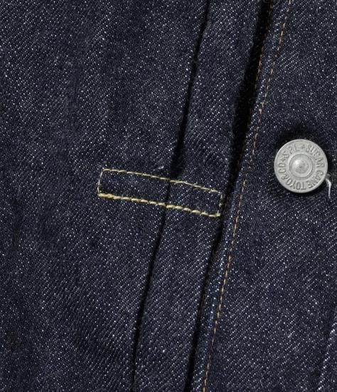 フロントや袖口のタックボタンが、パンツのフライ用のスモールボタンからトップ用のフルサイズに変わって間もない時代の1936年モデル・デニムブラウス。経糸7番×緯糸7番の未熟な紡績のムラ糸を使用した13.5oz.セルビッジデニムに、戦前らしいオレンジがメインのステッチワークが映えている。左胸ポケットのフラップの裏側にはライトオンスデニムを使用し、前身頃の身返し端にはセルビッジが見られる。